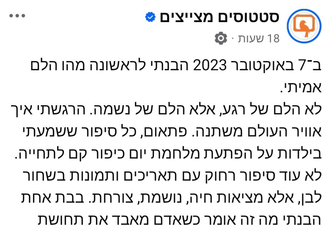 On October 7, I learned what pain is. But since then, slowly, I am also learning what rebirth means. It doesn’t happen in a single day, nor with a cry. It begins with a breath. A look. A decision to get up in the morning and say: I’m still here. And I still believe in good.