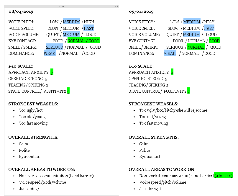 • I noticed my skill to be good enough, because the initial interaction went well. To me this opens a door to creativity and texting isn't to hard. I just need to avoid bad texting and focus more on infield game.