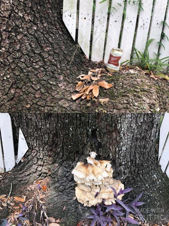 hahaha. Yesterday I saw these two trees in front of a house along their white fence one after another, mushrooms and then a beer can at the base of each tree