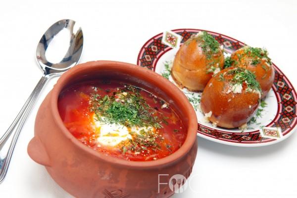 It is served hot with garlic bread and sour cream.